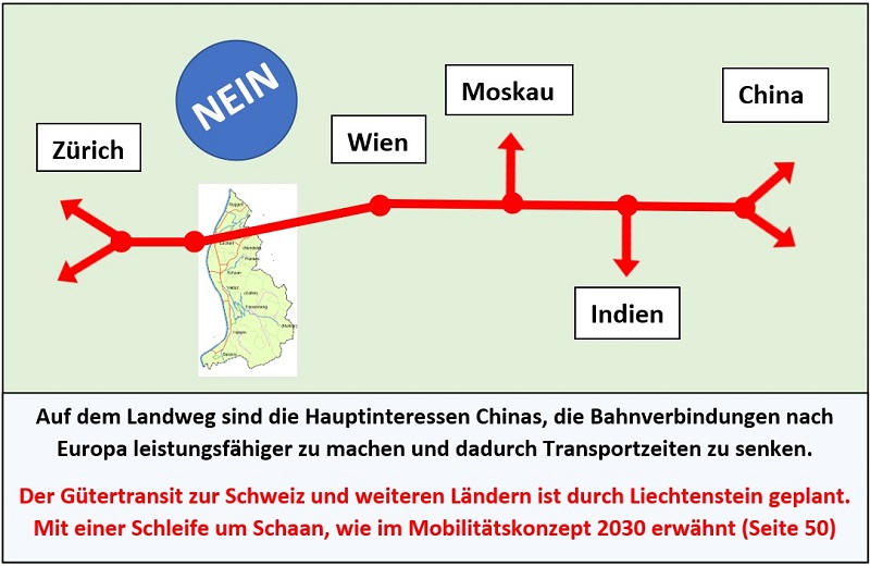 Die Schweiz tauscht mit China und Russland rege Waren aus. Für die ÖBB sehr lukrative Transportaufträge. Die Bahn durch Liechtenstein ist schneller als das Schiff. Als einzige hochrangige Verbindung Wien – Schweiz ist im ÖBB «Zielnetz 2025+» Feldkirch-Buchs eingezeichnet. Mit der Anbindung an die russische Bahn kommen mehr und längere Züge.