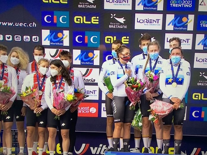 Die Deutsche Mixed-Staffel hat sich bei der Straßen-EM im gemeinsamen Zeitfahrwettbewerb die Goldmedaille gesichert. Lisa Brennauer, Lisa Klein, Mieke Kröger, Miguel Heidemann, Michel Heßmann und Justin Wolf waren auf dem 54 Kilometer langen Kurs von Plouay 26 Sekunden schneller als die Schweiz mit Elise Chabbey, Marlen Reusser, Kathrin Stirnemann, Stefan Bissegger, Robin Froidevaux und Claudio Imhof. 2.35 Minuten hinter der Siegerzeit holte das italienisches Sextett die Broncemedaille.