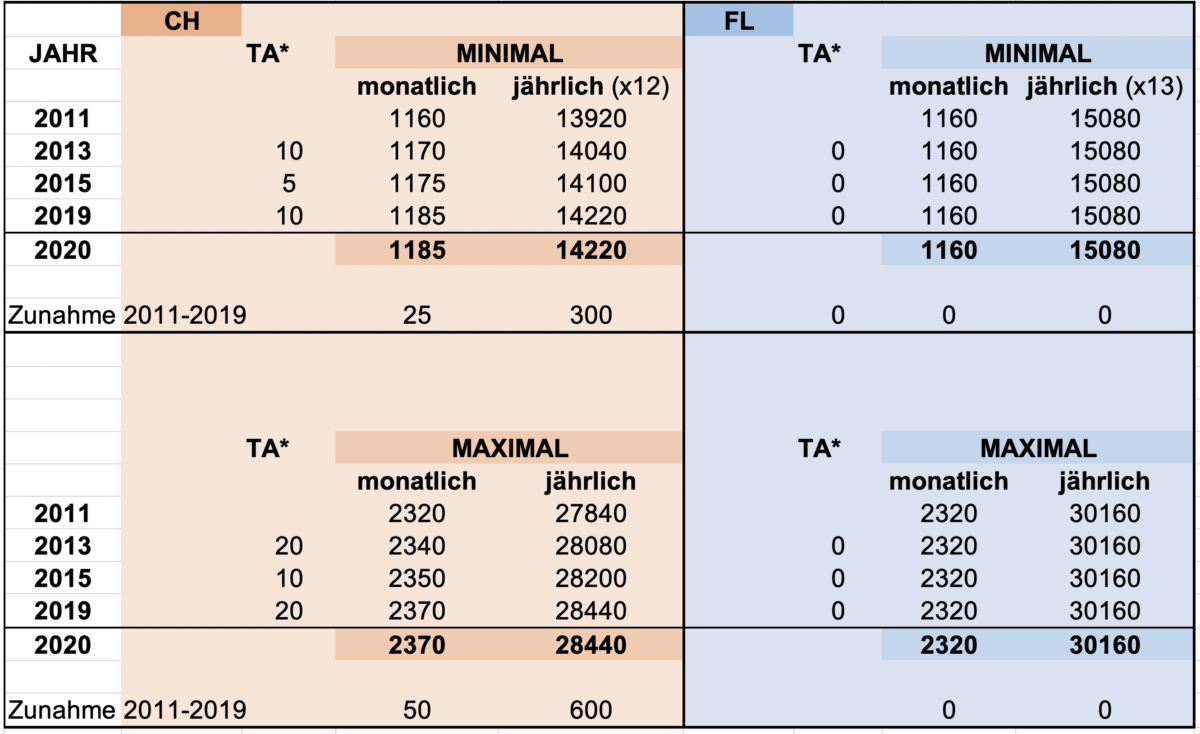 In Liechtenstein beträgt die minimale Einzelrente seit 2011 monatlich 1160 Franken, in der Schweiz ist diese seit 2011 von monatlich 1160 Franken auf 1185 Franken gestiegen. Dies gilt analog für die maximale Einzelrente: Sie beträgt in Liechtenstein seit 2011 unverändert monatlich 2320 Franken, während sie in der Schweiz auf monatlich 2370 Franken gestiegen ist.