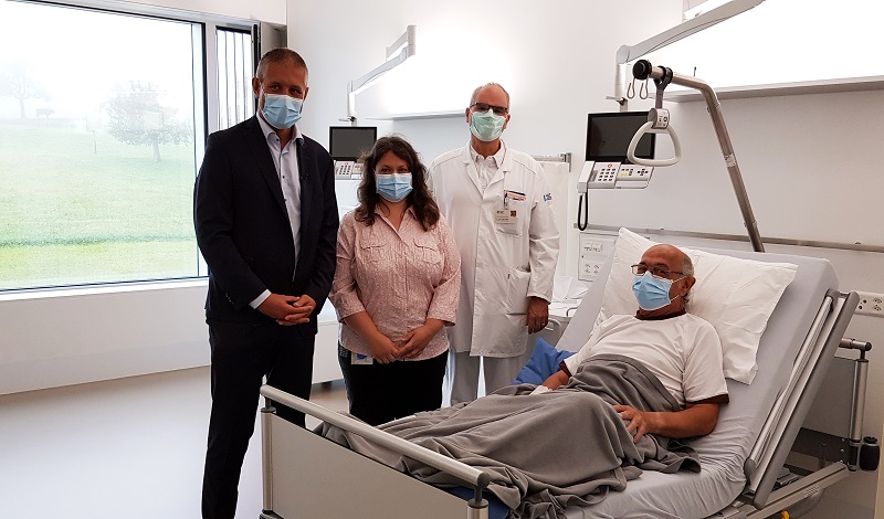 Bild: Hans Frey, der erste Patient im Neubau wird bei seiner Ankunft von CEO Stefan Lichtensteiger, Kerstin Härtl, Leitung Pflege Spital Grabs und Dr. med. Yves Crippa, Spitalleiter Spital Grabs, begrüsst.