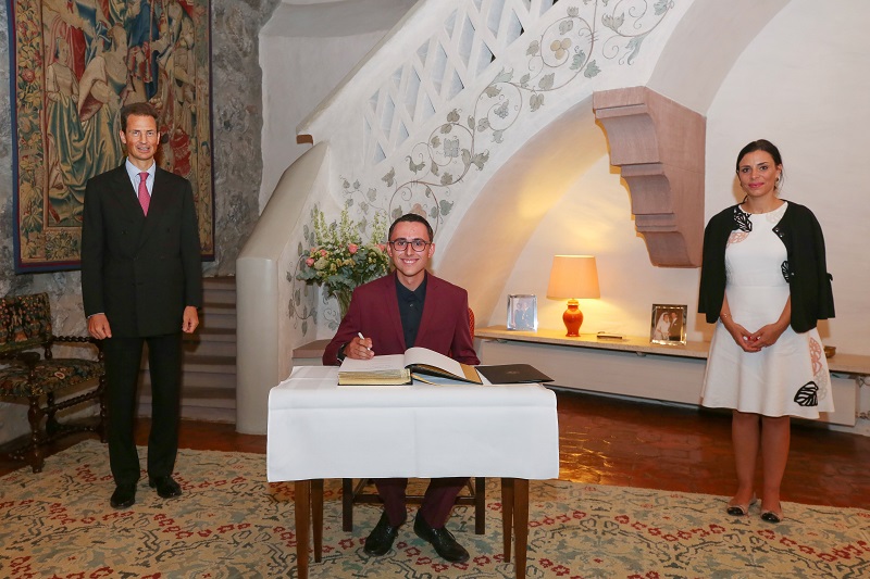 Bild: Hier trägt sich Janis Roth mit der noch nie erreichten Note 6.0 ins Goldene Buch auf Schloss Vaduz ein. Erinnerungsfoto mit S.D. Erbprinz Alois, Janis Roth und Bildungsministerin Dominik Hasler. Foto: @Brigitte Risch