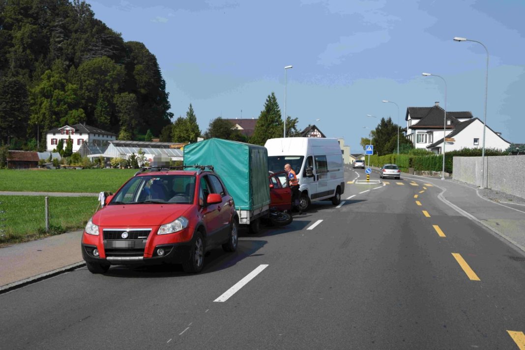 Ein 30-jähriger Lieferwagenfahrer fuhr von Buriet in Richtung Rheineck Zentrum. Vor ihm fuhren ein 49-jähriger Mann mit seinem Auto und Anhänger, ein 39-jähriger Mann mit seinem Motorrad und eine 57-jährige Frau mit ihrem Auto in genannter Reihenfolge. Der 30-Jährige bemerkte zu spät, dass die vor ihm fahrenden Fahrzeuge verkehrsbedingt abbremsten. Er kollidierte in der Folge mit dem Heck des Autos der 57-Jährigen. Durch die Wucht des Aufpralls wurden das Auto der 57-Jährigen sowie das Motorrad und der Autoanhänger ineinandergeschoben. Die 57-jährige Autofahrerin wurde leicht verletzt von der Rettung ins Spital gebracht. Der Sachschaden beläuft sich auf rund 10’000 Franken.