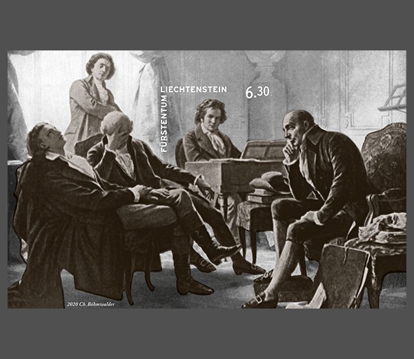 Mit dem Sonderblock «Am Klavier zu Freunden» (Wertstufe CHF 6.30) erinnert die Philatelie Liechtenstein an den 250. Geburtstag des bedeutenden Komponisten Ludwig van Beethoven. Der im Stahlstich gefertigte Sonderblock zeigt den Künstler am Klavier sitzend im Kreise von Freunden. Beethoven wurde 1770 in Bonn geboren, überliefert ist mit dem 17. Dezember lediglich sein Taufdatum. Schon als Kind lernte er Klavier, Orgel und Violine und gab mit sieben Jahren sein erstes Konzert. 1792 zog Beethoven nach Wien und blieb dort bis zu seinem Lebensende 1827. Mit ihm ging auch das Zeitalter der Wiener Klassik zu Ende.