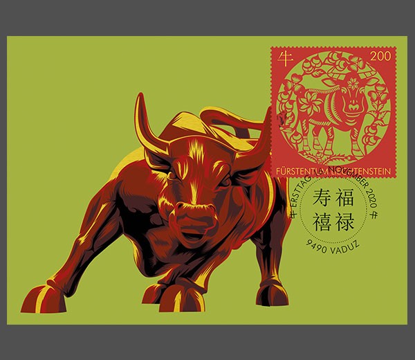 Bereits zum zehnten Mal in Folge veröffentlicht die Philatelie zum Jahresende eine Briefmarke mit einem Motiv aus den chinesischen Tierkreiszeichen, unter dessen Zeichen das kommende Jahr im Reich der Mitte steht. Die selbstklebende Sondermarke «Jahr des Ochsen» (Wertstufe CHF 2.00) wurde auch in diesem Jahr in Form eines filigranen Scherenschnitts gestaltet und mittels modernster Lasertechnologie gefertigt. Der Bogen vereint vier Wertzeichen und ist in Form eines Ochsen ausgestanzt. Eine Goldfolienprägung verleiht ihm eine edle Note. Dem Ochsen (auch als Büffel bekannt) werden im chinesischen Horoskop Eigenschaften wie Fleiss, Zuverlässigkeit, Kraft und Entschlossenheit zugeschrieben.