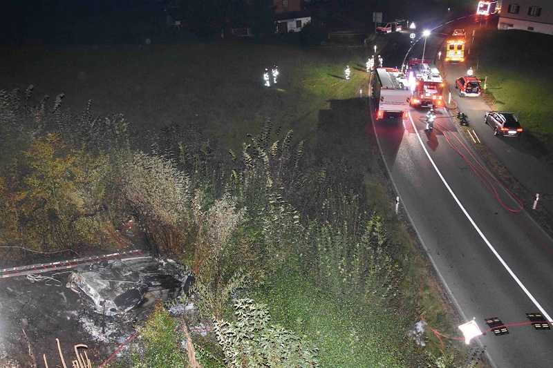 Fünf Jugendliche mussten nach Unfall aus brennendem Auto (l.) befreit werden. Alle wurden ins Spital eingeliefert.