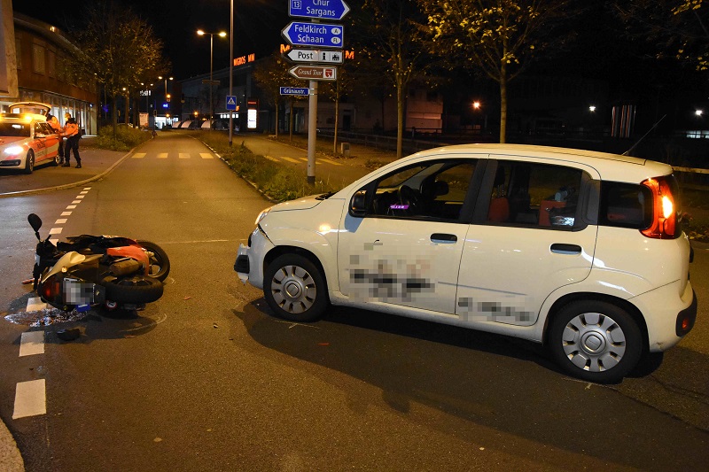 Buchs – Am Freitagabend (30.10.2020), kurz nach 21:30 Uhr, ist es auf der Churerstrasse zu einem Verkehrsunfall zwischen einem Auto und einem Motorrad gekommen. Eine 17-jährige Motorradfahrerin wurde dabei leicht verletzt.