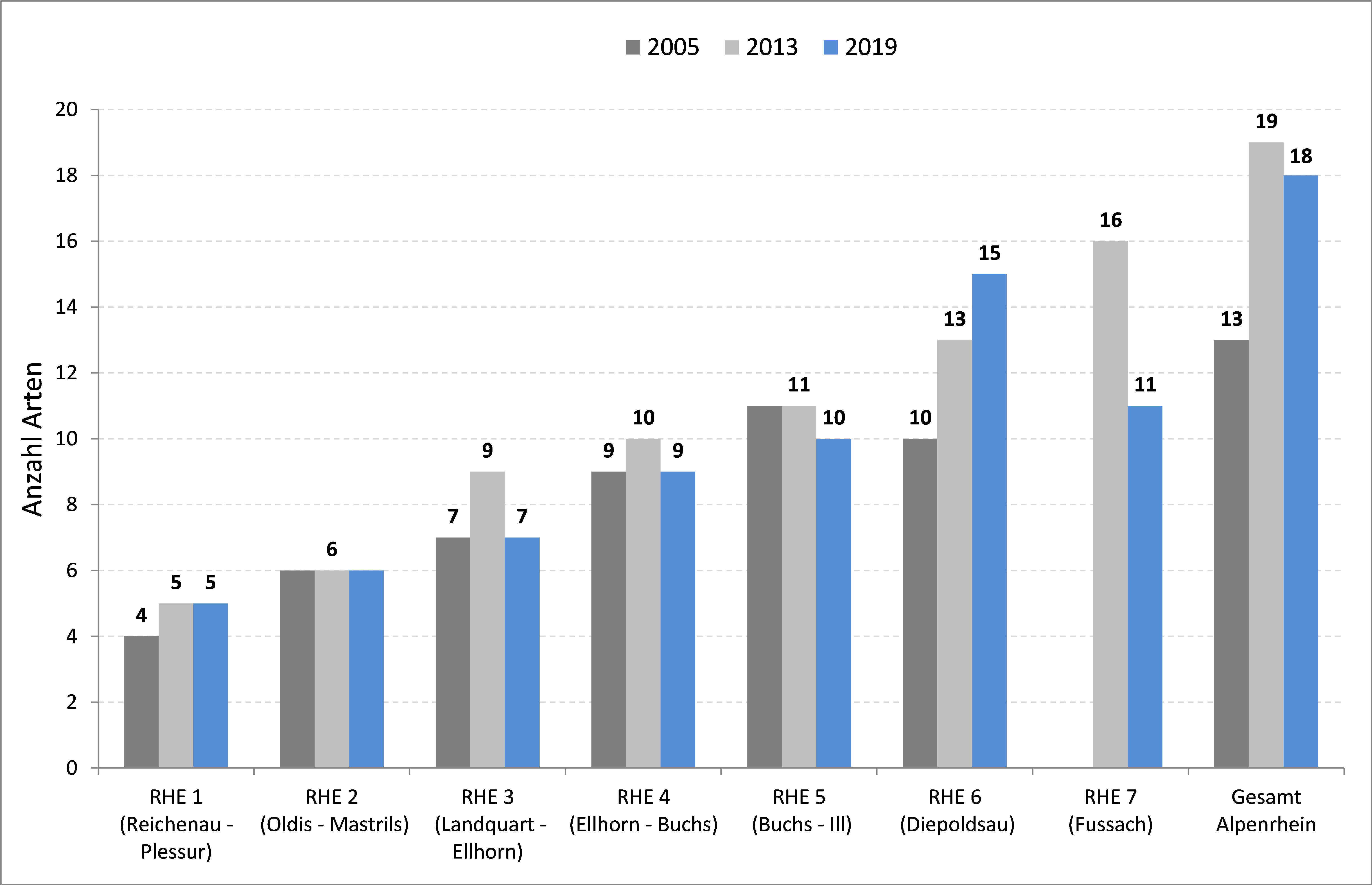 Lediglich die europaweit geschützte Art Strömer scheint mit den sehr eingeschränkten Lebensbedingungen im Alpenrhein zurecht zu kommen und konnte ihre Dominanz sogar erhöhen. Auch die Zubringer am Alpenrhein vermögen die Defizite im Rhein nicht zu kompensieren und weisen keinen guten fischökologischen Zustand auf.