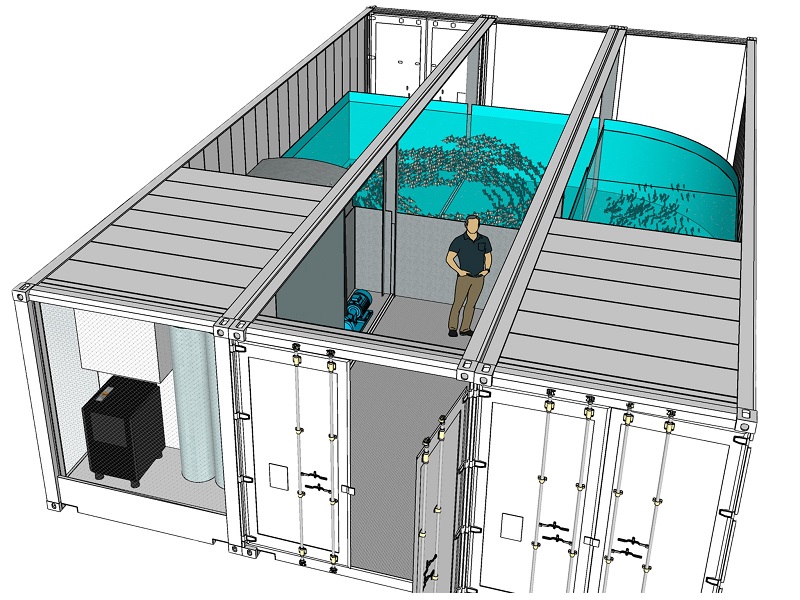 In einem Cube aus Schiffscontainern ist die gesamte Fischzucht untergebracht. (Grafik: SEAWATER)