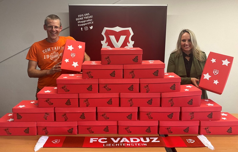 Der FC Vaduz nimmt auch in diesem Jahr an der Aktion «Weihnachten im Schuhkarton» teil. Dabei haben das Geschäftsstellenteam, die Spieler, Trainer und Betreuer der 1. Mannschaft, Schuhkartons mit vielen Geschenken und ganz viel Liebe gepackt. Neben der individuellen Bestückung der Kartons wurden diese durch Fanartikel sowie Autogrammkarten mit persönlichen Widmungen der FCV-Spieler ergänzt.