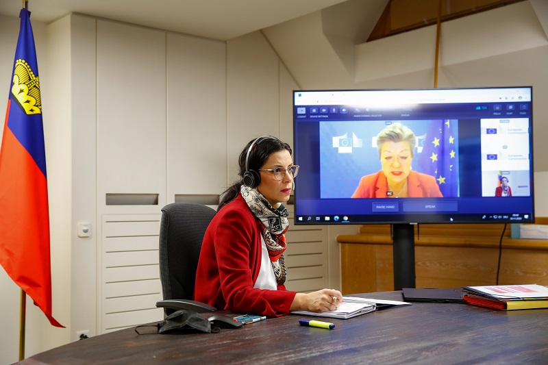 Liechtensteins Regierungsraetin fuer Inneres, Bildung und Umwelt, Dominique Hasler, bei einer Videokonferenz zum 1. Schengen-Forum, aufgenommen am Montag, 30. November 2020, im Regierungsgebaeude in Vaduz. Foto & Copyright: IKR/Eddy Risch.