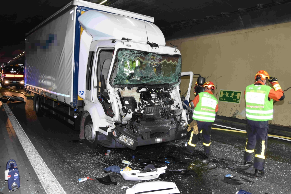 Ein 47-jähriger Mann fuhr mit seinem Lastwagen durch den Tunnel, als der Lastwagen vor ihm verkehrsbedingt abbremsen musste. Trotz eingeleiteter Vollbremsung des 47-Jährigen kam es zur Auffahrkollision zwischen den beiden Lastwagen. Durch die Kollision wurde der 47-Jährige sowie seine 15-jährige Beifahrerin in der Fahrerkabine eingeklemmt. Die Feuerwehr befreite sie. Anschliessend brachte sie die Rettung mit leichten Verletzungen ins Spital. Der entstandene Sachschaden beträgt rund 35’000 Franken.