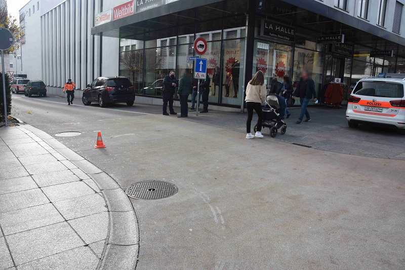 Zur selben Zeit spazierten ein 53-jähriger und ein 31-jähriger Mann parallel zur Bahnhofstrasse Richtung Bahnhof. Die 4-jährige Tochter des 31-Jährigen befand sich dabei in geringer Distanz hinter ihnen. Mutmasslich fuhr sie auf einem Scooter. Auf Höhe der Verzweigung überquerten die beiden Männer und das Mädchen die Bäckergasse. Um ihnen den Vortritt zu gewähren, hielt der 44-jährige Autofahrer vollständig an. Da er das Mädchen nicht wahrnahm, setzte er seine Fahrt danach langsam fort, wobei er mutmasslich mit der linken Fahrzeugseite das Mädchen leicht touchierte und dieses dadurch zu Fall kam. Das Mädchen wurde durch die Rettung mit leichten Verletzungen ins Spital gebracht.