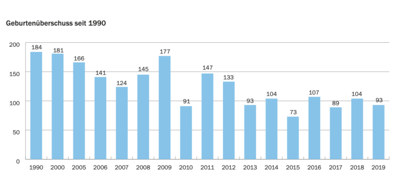Der Geburtenüberschuss (Lebendgeborene abzüglich Gestorbene) betrug im Jahr 2019 93 Personen. Im Vorjahr war der Geburtenüberschuss mit 104 Personen höher gewesen.