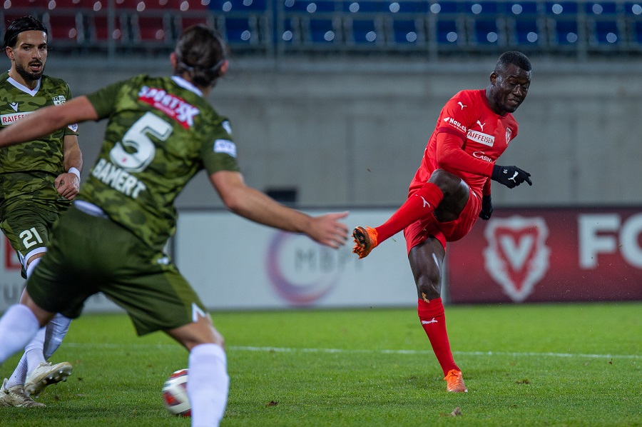Coulibaly beim 4:1-Sieg des FC Vaduz gegen den FC Sion am 28.November 2020 im Rheinparkstadion. Damals erzielte Cicek zwei und Coulibaly einen Treffer. Ihr Einsatz ist morgen in Sion wegen Verletzungsgründen nicht sicher. Foto: Jürgen Posch
