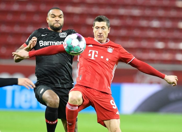 Doch in der 44. Minute schenkte Leverkusen die Führung mit einem halben Eigentor wieder her: Edmond Tapsobas Fehlpass ermöglichte Thomas Müller eine Flanke von rechts. In der Mitte verpassten Torwart Hradecky und Jonathan Tah gemeinsam den Ball – Lewandowski wartete dahinter und hatte leichtes Spiel.