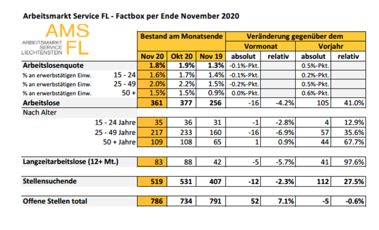 Beim Arbeitsmarkt Service Liechtenstein (AMS FL) waren Ende November 361 Arbeitslose gemeldet, 16 Personen weniger als im Vormonat. Die Arbeitslosenquote verringerte sich damit von 1,9 Prozent im Oktober 2020 auf 1,8 Prozent im Berichtsmonat. Gegenüber dem Vorjahresmonat erhöhte sich die Arbeitslosigkeit um 105 Personen. Die Arbeitslosenquote stieg gegenüber dem Vorjahresmonat um 0,5 Prozentpunkte.