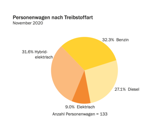 43 Personenwagen (32.3%) waren Benziner, 36 Personenwagen (27.1%) waren Dieselfahrzeuge, 42 waren hybridelektrisch und zwölf rein elektrisch angetriebene Personenwagen mit Anteilen von 31.6% bzw. 9.0% aller im Berichtsmonat erstzugelassenen Personenwagen.