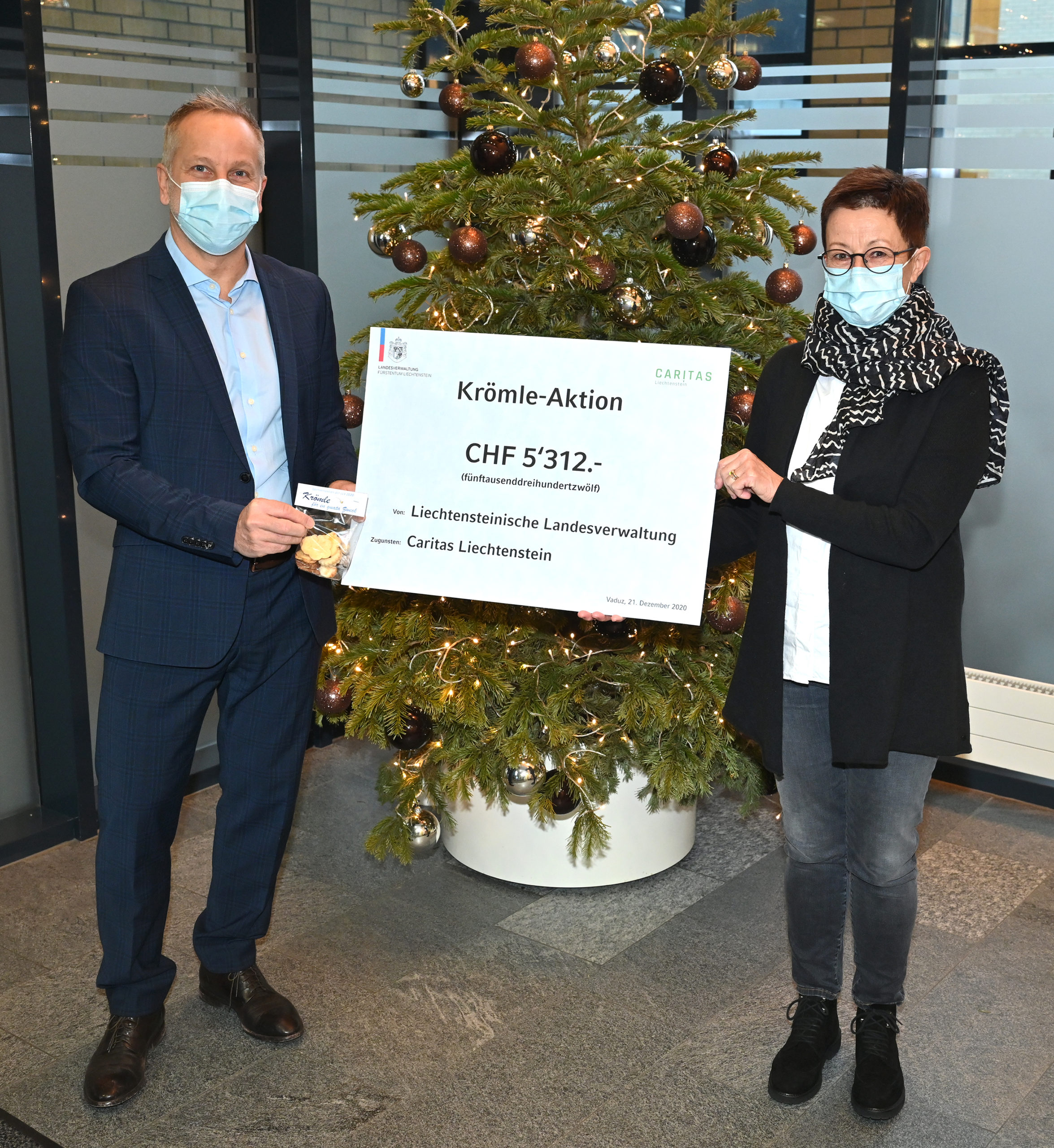 Die bereits zum 4. Mal durchgeführte Spendenaktion der Liechtensteinischen Landesverwaltung mit selbstgebackenen Krömle zeigt die Grosszügigkeit der Mitarbeitenden. Der ansehnliche Betrag von CHF 5’312.– kommt vollumfänglich der Caritas Liechtenstein zu Gute, welche damit bedürftige Familien mit Kindern und ältere Menschen in Liechtenstein unterstützt.