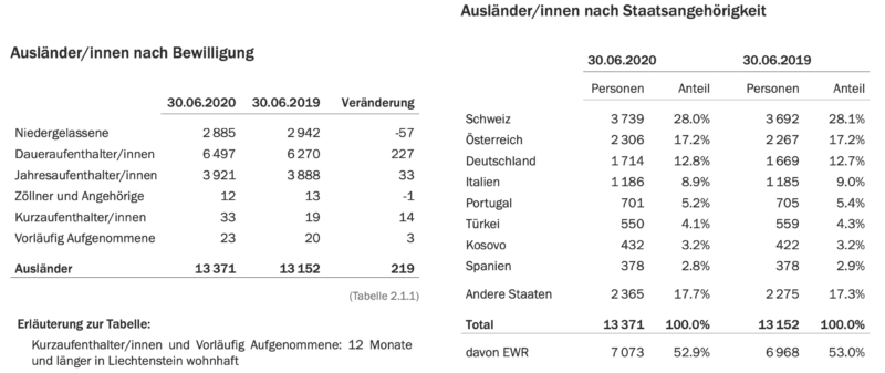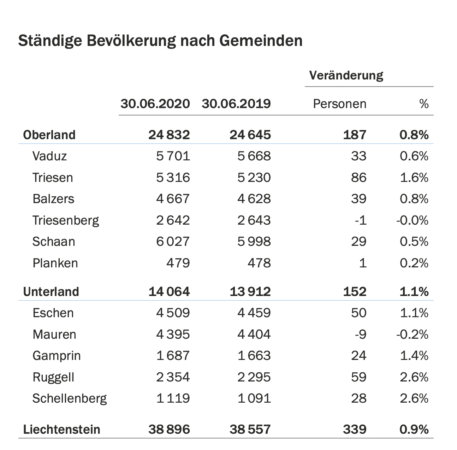 Die stärksten prozentualen Zunahmen am 30. Juni 2020 gegenüber dem Vorjahr verzeichneten Ruggell und Schellenberg mit jeweils mit 2.6% sowie Triesen mit 1.6%. In den Gemeinden Mauren (neun Personen) und in Triesenberg (eine Person) wurden Bevölkerungsrückgänge berechnet. Werden die per 30. Juni 2000 auf 100.0 indexierten Werte im Zeitraum bis heute betrachtet, so werden die stärksten Bevölkerungszunahmen im Unterland gemessen. Per 30. Juni 2020 wird für Gamprin ein Index von 143.5, für Ruggell ein Index von 137.9 und für Mauren ein Index von 134.7 ausgewiesen. Im Oberland fallen die Indices mit 130.5 für Planken, 122.2 für Triesen und 114.6 für Vaduz tiefer aus.