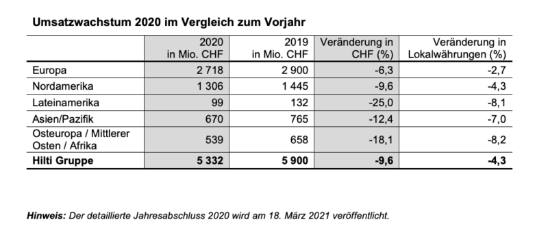 Die Spuren der Corona-Pandemie bleiben bei der Hilti Gruppe sichtbar: Trotz Erholungstendenzen lag der Umsatz 2020 mit CHF 5,3 Mrd. um 9,6 Prozent unter dem Vorjahr, in Lokalwährungen um 4,3 Prozent.