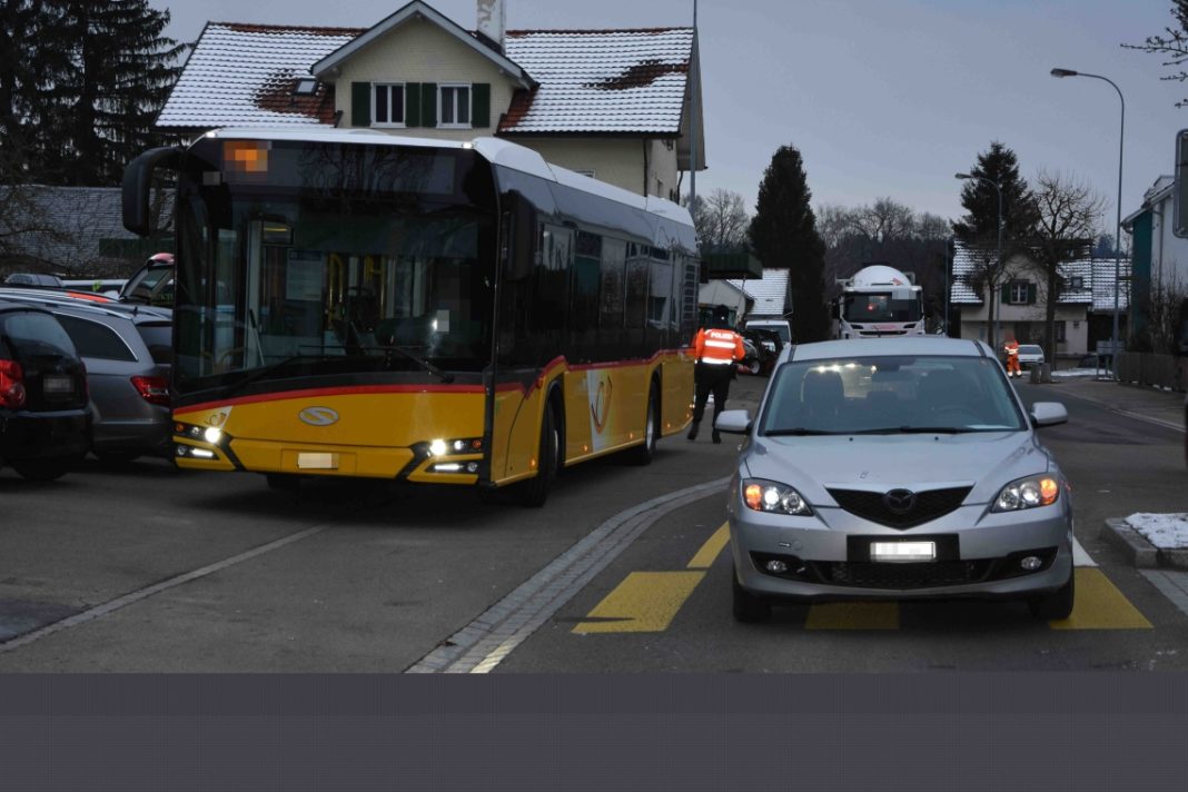 Eine 26-jährige Frau befuhr mit ihrem Auto die Leo Jung-Strasse von Oberbüren her in Richtung Dietenwil. Auf Höhe der Liegenschaft Nr. 6 schloss sie auf ein am Strassenrand haltendes Postauto auf. Die Autofahrerin beabsichtigte, am stehenden Postauto vorbei zu fahren. Zur selben Zeit verliess ein 21-jährigen Mann das Postauto um die Strasse auf dem direkt davor liegenden Fussgängerstreifen zu überqueren. Als er vor dem Postauto die Fahrbahn betrat, wurde er vom Auto der jungen Frau erfasst. Der Fussgänger wurde bei der Kollision unbestimmt verletzt und wurde durch den Rettungsdienst ins Spital gebracht. Am beteiligten Auto entstand Sachschaden von zirka 1000 Franken.