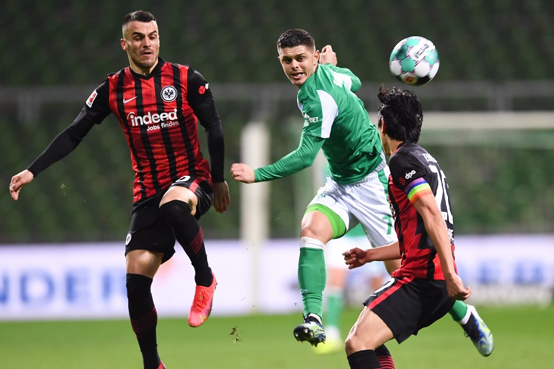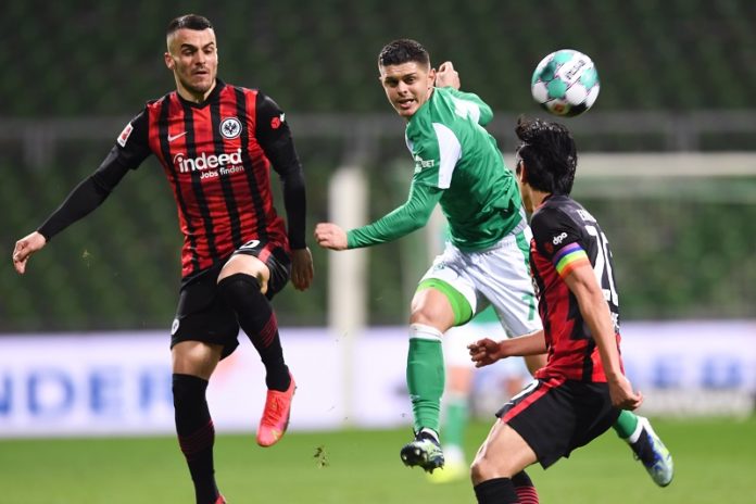 Kostic, Rashica, Bremen und Makoto Hasebe, v.l. im BL-Spiel Bremen-Eintracht Frankfurt, 2-1-Sieg für Bremen, 26.2.2021. Foto: Picture Alliance, Frankfurt-Main
