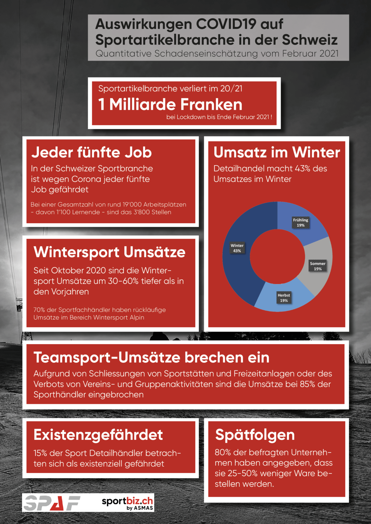 Im Januar 2021 wurde von der Firma Hanser Consulting AG eine Branchenumfrage durchgeführt. Basierend darauf wurde eine Schadenseinschätzung zu den Folgen der Coronapandemie für die Schweizer Sportbranche erstellt. Dies im Auftrag der beiden Brachenverbände SPAF (Verband Schweizer Sportartikelfabrikanten, Importeure und Agenten) und ASMAS (Verband Sportfachhandel Schweiz).