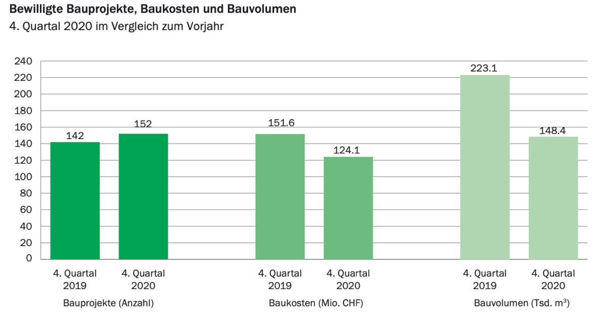 Gemäss den Ergebnissen des Amtes für Statistik wurden im 4. Quartal 2020 vom Amt für Bau und Infrastruktur 152 Baubewilligungen erteilt. Im gleichen Quartal des Vorjahres waren es 142 Baubewilligungen gewesen.
