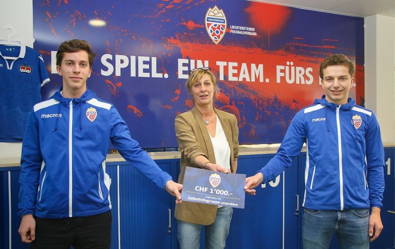Liechtensteins U21-Nationalteam hat seine Mannschaftskasse geleert und den darin enthaltenen Beitrag von 1.000 Schweizerfranken an die Selbsthilfegruppe «Unanders» gespendet. Die Übergabe des Spendenbetrages an Eva Wohlwend von der Selbsthilfegruppe erfolgte kürzlich durch Mannschaftskapitän Simon Lüchinger und Benjamin Vogt auf der Geschäftsstelle des LFV.