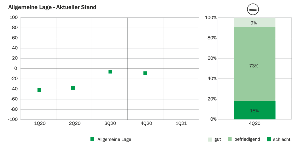 Für das 1. Quartal 2021 gehen die Unternehmen von einer unveränderten Geschäftslage aus. Auch bezüglich Rentabilität und Personalbestand zeichnen sich gemäss den Befragten keine Änderungen ab. Die COVID-19-Pandemie hält die Unternehmen aber weiterhin im Griff: 61% der Befragten machen andere als die vorgeschlagenen Produktionshemmnisse aus, wobei die Pandemie sowie Massnahmen zu deren Bekämpfung dominieren.