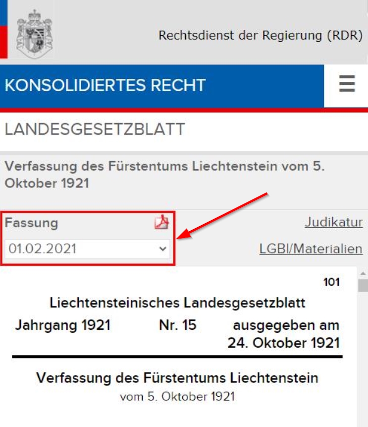 Mehr als 20’000 Fassungen von liechtensteinischen Rechtsvorschriften sind derzeit auf http://www.gesetze.li abrufbar. Mit einem Klick findet man nicht nur sämtliche seit 1863 kundgemachten Landesgesetzblätter und alle aktuell geltenden Rechtsvorschriften in konsolidierter Form, sondern auch deren historische Fassungen zurück bis 1. Januar 2010. Eine historische Fassung zeigt eine Rechtsvorschrift exakt so, wie sie zu einem beliebigen Datum in der Vergangenheit Gültigkeit hatte.