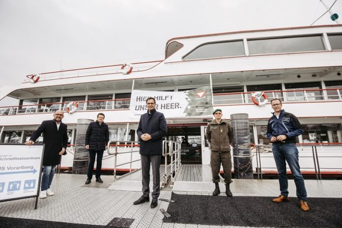 (VLK) – Das Bundesheer hat auf dem Motorschiff „Vorarlberg“ eine Teststation eingerichtet. Gemeinsam mit Landesrat Christian Gantner, Militärkommandant Gunther Hessel und dem Bregenzer Bürgermeister Michael Ritsch besichtigte Landeshauptmann Markus Wallner heute (Dienstag) die schwimmende Teststation: „Ein verantwortungsvolles Öffnen ist nur dann möglich, wenn die Testkapazitäten der Nachfrage entsprechend auch weiter ausgebaut werden“, betonte der Landeshauptmann.
