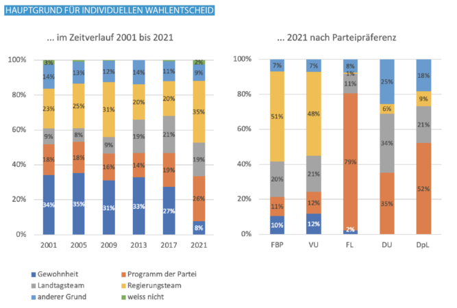 Der meistgenannte Wahlgrund war das Regierungsteam. Über 35 Prozent gaben demnach an, dass das Regierungsteam für sie der Hauptgrund war, weshalb sie sich für den Stimmzettel einer bestimmten Partei entschieden haben (siehe Abbildung auf Seite 8). Wenig überraschend war das Regierungsteam vor allem bei den Wählenden von FBP und VU sehr wichtig mit jeweils ca. 50 Prozent. Im Unterschied dazu wurden die drei kleineren Parteien – insbesondere die FL und die DpL – vor allem wegen ihres inhaltlichen Programms gewählt. Auch dies überrascht wenig, da diese beiden Parteien einerseits keine Regierungskandidatur stellten und von allen Parteien wohl das schärfste ideologische Profil aufweisen.