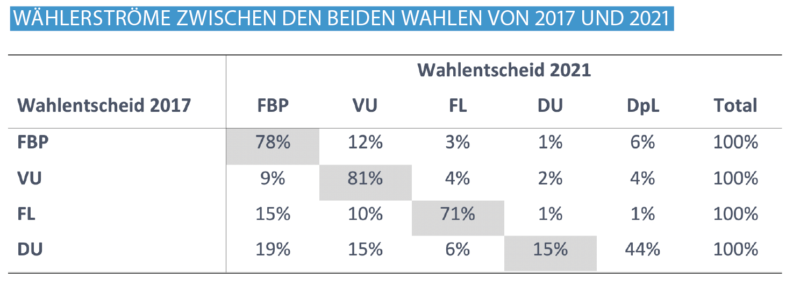 Diese Frage ist natürlich klar zu verneinen. Es ist davon auszugehen, dass die traditionellen Parteibindungen hierzulande weiterhin stark sind und deshalb einen grossen Einfluss auf das Wahlverhalten ausüben. Dies zeigt z. B. die Analyse der sogenannten Wechselwählenden. Dazu zählen Personen, welche sowohl 2017 als auch 2021 an den Wahlen teilnahmen, dabei aber jeweils eine andere Partei wählten. Gemäss den Daten der Wahlumfrage haben ca. 80 Prozent der Wählerinnen und Wähler von FBP und VU sowie über 70 Prozent der FL-Wählerinnen und -Wähler bei den Wahlen 2017 und 2021 die gleiche Partei gewählt (siehe Tabelle Wählerströme). Vermutlich hat ein Gross-