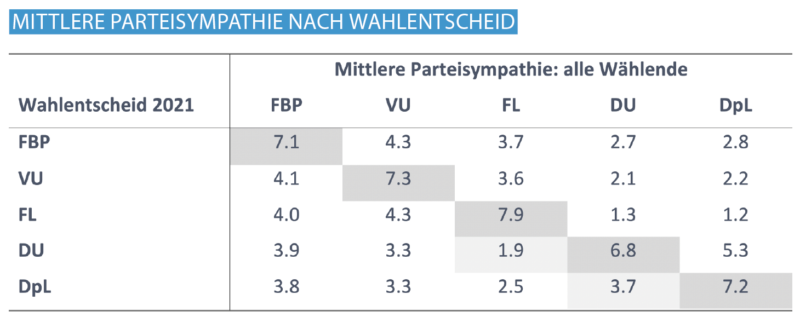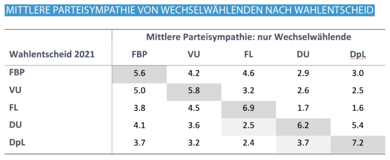 Die traditionelle Parteibindung wird nochmals deutlicher, wenn wir uns nur die Wechselwählenden anschauen (siehe Tabelle oben). Gerade bei den Wechselwählerinnen und -wählern von VU und FBP liegt die mittlere Sympathie für die von ihnen (neu) gewählte Partei tiefer und die mittlere Sympathie für die andere (früher gewählte) Partei höher als bei der Auswertung aller Wählenden. Dies verdeutlicht, dass diese Wählenden in ihrem Wahlentscheid weniger gefestigt sind und durchaus wieder die Partei wechseln könnten. Die Sympathie für die Partei ist deshalb auch ein guter Indikator, um das Wählerpotenzial einer Partei abzuschätzen, und damit auch, von welcher Partei diese Wählenden grundsätzlich kommen könnten. Interessant ist in diesem Zusammenhang sicherlich auch, dass die DpL bei den DU-Wählenden grundsätzlich viel Sympathie geniesst, während jedoch die Wählerinnen und Wähler der anderen Parteien den beiden Parteien DU und DpL nur wenig Sympathie entgegenbringen. Das Wählerpotenzial der noch jungen Partei DpL scheint sich also im Moment vor allem auf die Wählenden der DU zu konzentrieren.