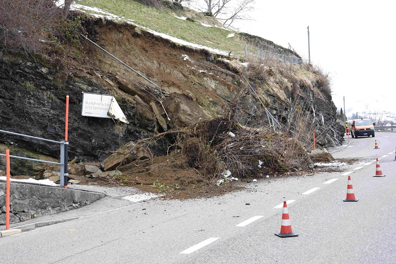 Amden – Am Sonntag (21.03.2021), um 11:45 Uhr, hat ein Erdrutsch die Hälfte der Amdenerstrasse im Bereich der Bushaltestelle Bellevue verschüttet.