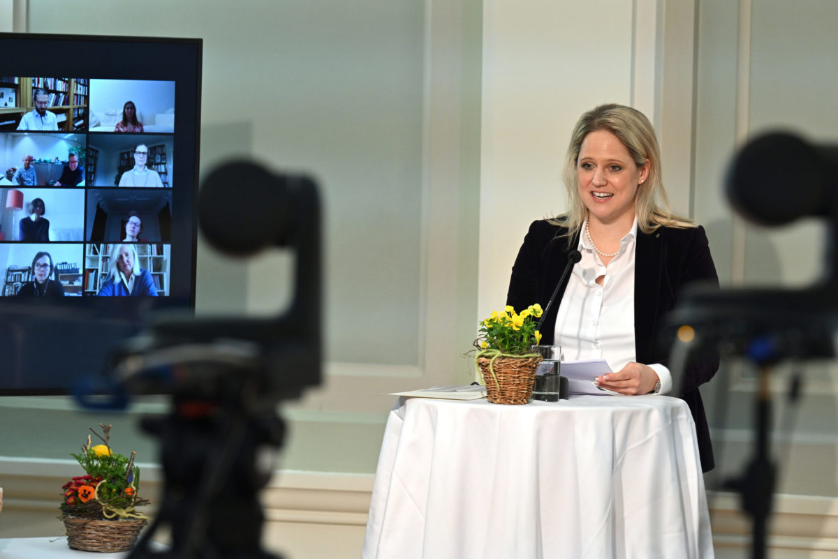 Am Mittwoch, 3. März, waren alle Preisträgerinnen und Preisträger virtuell zugegen, um zusammen in einer Feierstunde die Urkundenübergabe zu begehen, welche durch Kulturministerin Katrin Eggenberger vorgenommen wurde. Der Anlass ist durch Autor und Kabarettist Mathias Ospelt (Moderation) und Jazzmusiker Markus Gsell (Musik) umrahmt worden.