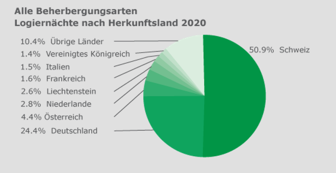 Mit einem Anteil von 50.9% an den Logiernächten war die Schweiz das wichtigste Herkunftsland (Wohnsitzstaat) der Gäste in den Beherbergungsbetrieben. Die Gäste aus der Schweiz verbrachten 64’949 Nächte in Liechtenstein.
