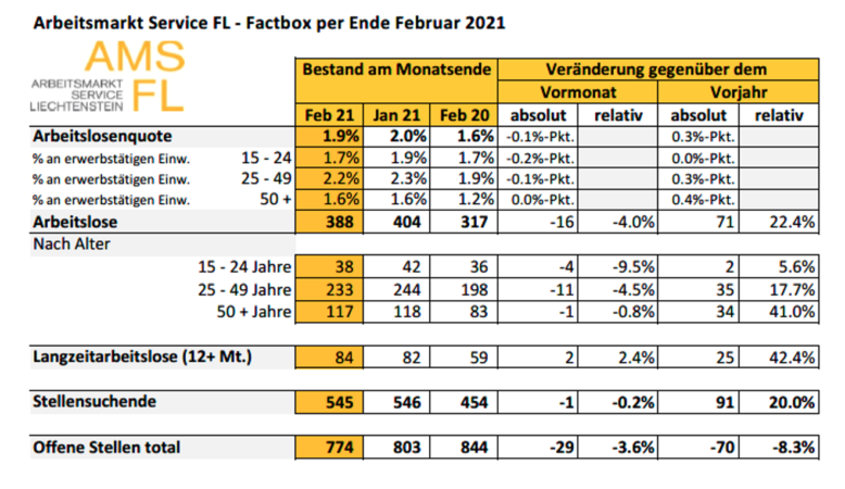 Die Arbeitslosenquote verringerte sich damit von 2 Prozent im Januar 2021 auf 1,9 Prozent im Berichtsmonat. Gegenüber dem Vorjahresmonat erhöhte sich die Arbeitslosigkeit um 71 Personen. Die Arbeitslosenquote stieg gegenüber dem Vorjahresmonat um 0,3 Prozentpunkte.