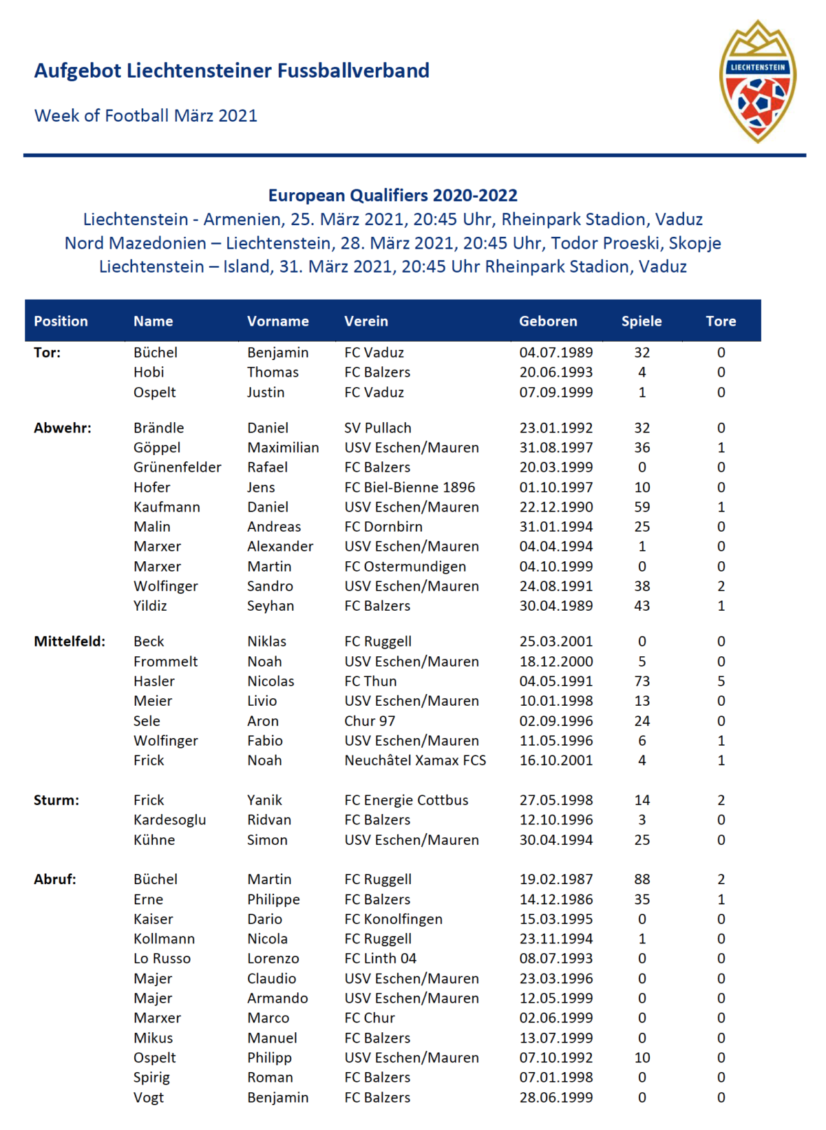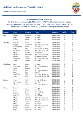 Der 23-Mann-Kader trifft sich am kommenden Montag zur Vorbereitung auf den Triple-Header Ende März. Zuvor erhofft sich der neue Nationaltrainer auch durch das Testspiel gegen den FC Dornbirn an diesem Mittwoch eine optimale Vorbereitungdarauf. Dieses Spiel findet aufgrund der aktuellen Coronaschutzmassnahmen unter Ausschluss der Öffentlichkeit statt.