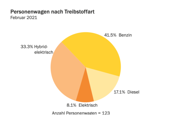 51 Personenwagen (41.5%) waren Benziner, 21 Personenwagen (17.1%) waren Dieselfahrzeuge, 41 waren hybridelektrisch und zehn rein elektrisch angetriebene Personenwagen mit Anteilen von 33.3% bzw. 8.1% aller im Berichtsmonat erstzugelassenen Personenwagen.