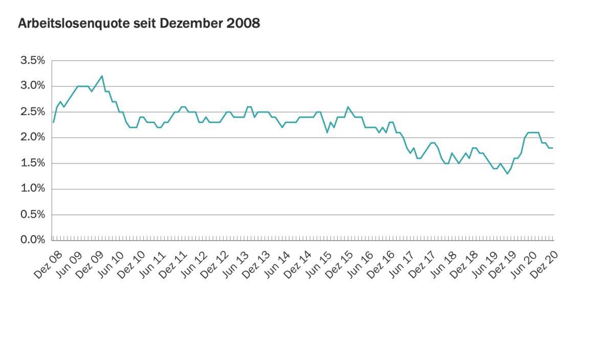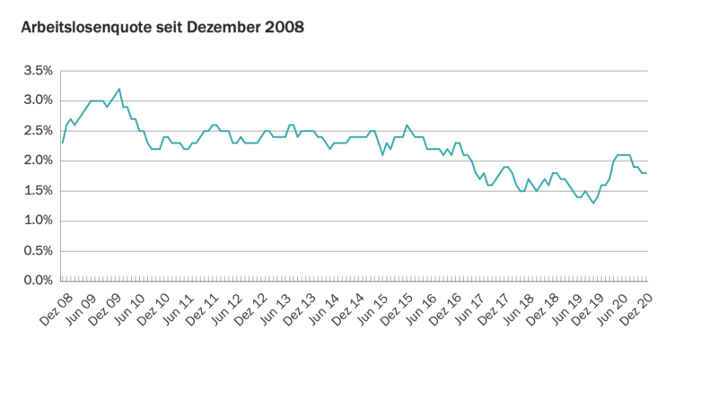 Im Jahr 2020 betrug gemäss den Ergebnissen des Amtes für Statistik die Arbeitslosenquote im Jahresdurchschnitt 1.9%. Im Vorjahr war die Arbeitslosenquote bei 1.5% gewesen. Im Jahresverlauf war die Arbeitslosenquote in den Monaten Januar und Februar mit jeweils 1.6% am tiefsten und im Mai bis August mit jeweils 2.1% am höchsten.