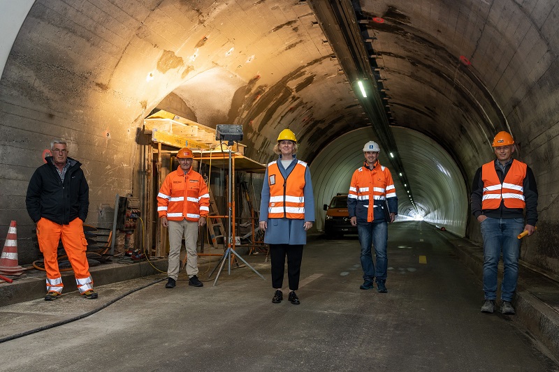 30. April 2021; Triesenberg; Besichtigung Sanierung Tunnel Gnalp-Steg. Von links: Theodor Sele (Amt fr Bau und Infrastruktur), Rony Bargetze (Amt fr Bau und Infrastruktur), Regierungsrtin Graziella Marok-Wachter, Marco Büchel ((Sprenger & Steiner Anstalt) und Hanswalter Bühler (Bühler Bauunternehmung AG) (Foto: IKR/Michael Zanghellini)