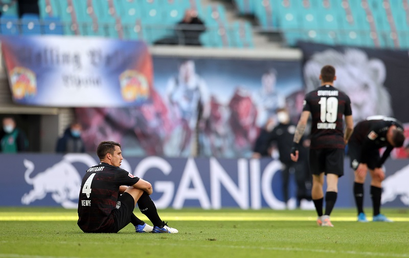 Kempf Marc Oliver, sitzend und Darko Churlinov (Nr.19), beide VfB Stuttgart im Spiel RB Leipzig - VfB am 25.4.2021. Stuttgart verliert 2:0. Foto: Picture Alliance, Frankfurt/Main.