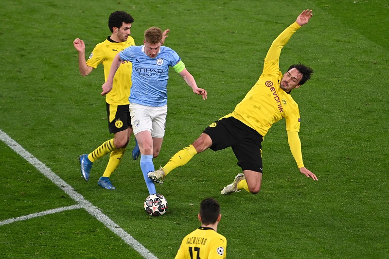 Hummels, De Bruyne und Mateu Morey von links im Kampf um den Ball. Viertelfinals der Champions League, BVB-Manchester City, 1:2, 14.4.2021. BVB ausgeschieden. Foto: Picture Alliance, FFM