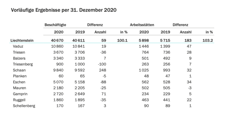 Die in Liechtenstein arbeitenden Voll- und Teilzeitbeschäf- tigten veränderten sich, gemäss den vorläufigen Ergebnissen des Amtes für Statistik, im Jahr 2020 mit einem Plus von 59 Personen auf insgesamt 40’670 Beschäftigte gegenüber 2019 nur wenig. Die daraus resultierende kaum merkliche Zunahme von 0.1% liegt deutlich unter dem Anstieg in den beiden Vorjahren von jeweils 2.5%.