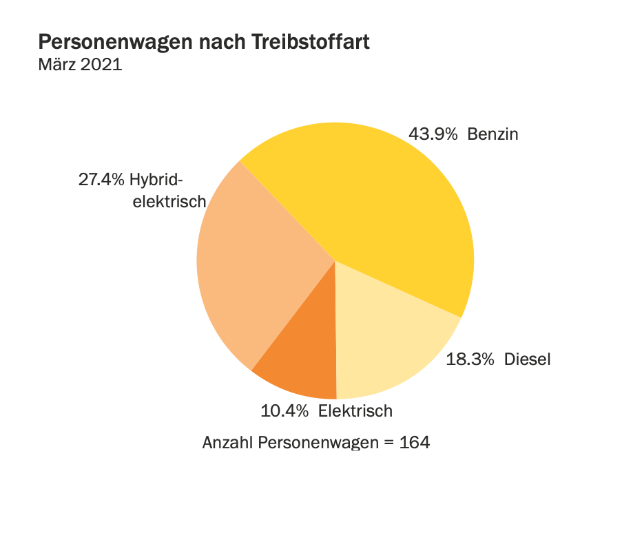 72 Personenwagen (43.9%) waren Benziner, 30 Personen- wagen (18.3%) waren Dieselfahrzeuge, 45 waren hybridelektrisch und 17 rein elektrisch angetriebene Personenwagen mit Anteilen von 27.4% bzw. 10.4% aller im Berichtsmonat erstzugelassenen Personenwagen.