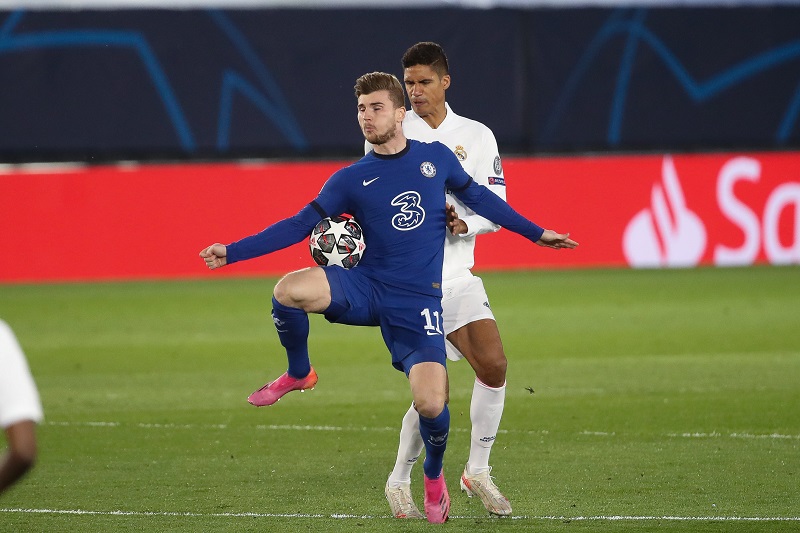 Torschütze Timo Werner im CL-Halbfinale gegen Reals Raphael Varane. Chelsea siegte gegen Real Madrid 2:0. Foto: Picture Alliance, Frankfurt/Main