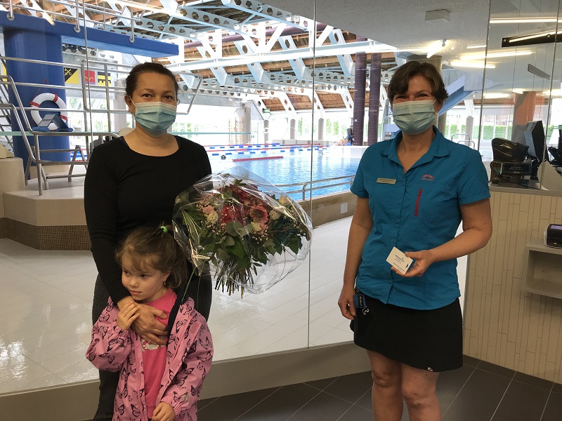 Bildlegende: Der drittmillionste Badegast Zerbini Nergis aus Vaduz (l.) mit Christina Risch, Leiterin des Hallenbades SZU (r.).