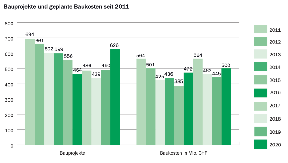 Die geplanten Baukosten stiegen im Berichtsjahr gegenüber dem Vorjahr von CHF 445.4 Mio. auf CHF 500.3 Mio. Private Auftraggeber planten mit Baukosten von CHF 439.1 Mio., bzw. CHF 49.8 Mio. mehr als im Vorjahr. Bei den öffentlichen Auftraggebern stiegen die projektierten Baukosten von CHF 56.1 Mio. auf CHF 61.2 Mio.